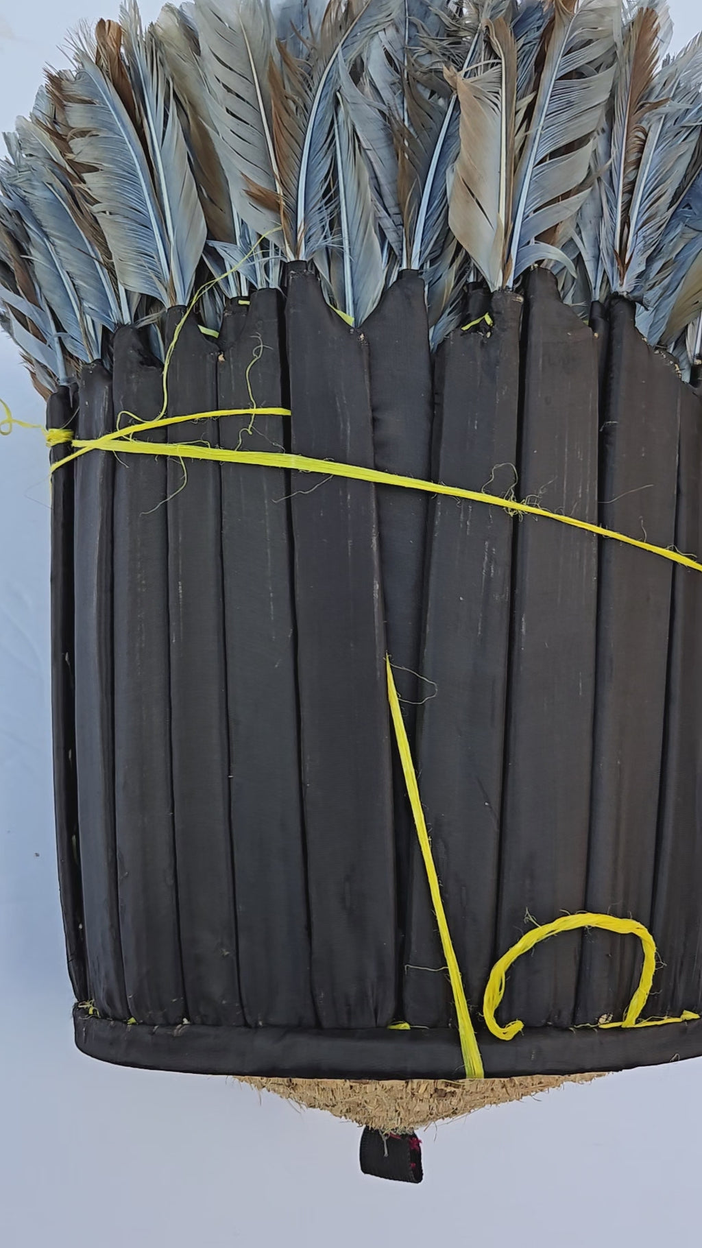 This masterpiece was handcrafted in Cameroon, is a testament to centuries of tradition from the Bamiléké tribes. These hats, symbols of prosperity and freedom, were once worn by medicine men and royalty during tribal ceremonies. Today, they transcend borders, adorning homes with their impressive beauty during Bamiléké traditional rituals. Made from natural or dyed feathers and woven raffia, each hat is a labor of love, taking artisans 2 to 3 days to complete.